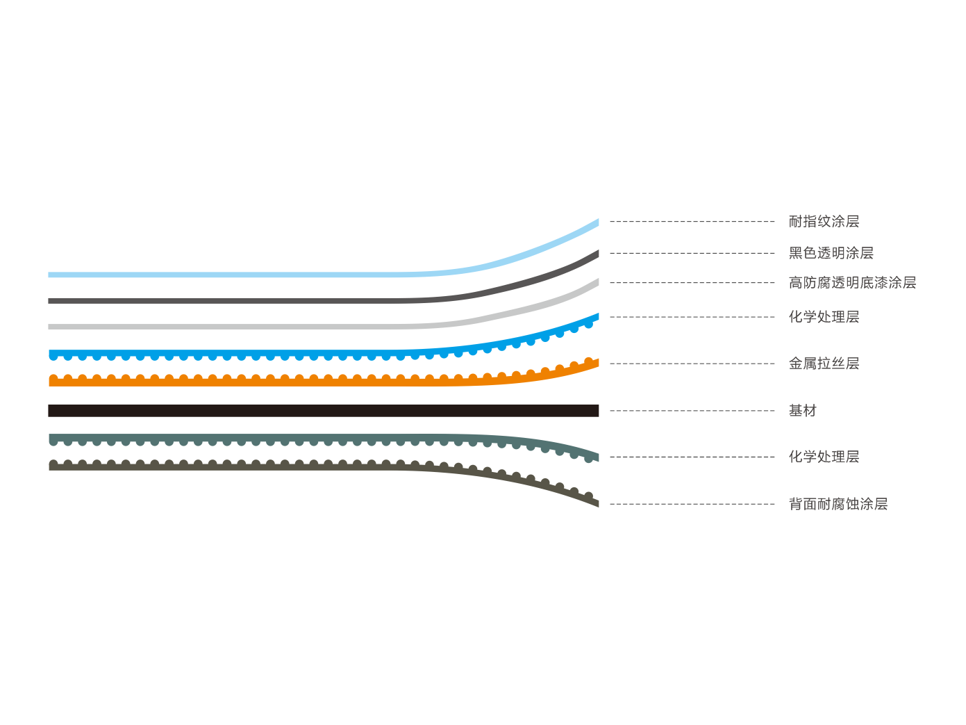 拉絲彩塗板在高端家(jiā)電金(jīn)屬板上通過多道工序加工呈現(xiàn)出不鏽鋼的外觀紋(wén)理,然後通過通透的底漆塗層增強其防腐效果,可以達到耐鹽霧240h的超高要(yào)求。在高(gāo)防腐底漆上使用鋼琴般的半透明黑色,使其(qí)外觀更(gèng)加莊重大氣,最後在(zài)其上(shàng)塗裝透明耐指紋(wén)塗層,讓其不僅有靚麗的顏色,同時更(gèng)加的使用。這種多層結構讓整體顏色更(gèng)加通透,質感更立體,已成功應用於冰箱,熱水器,電視機等領域(yù)。